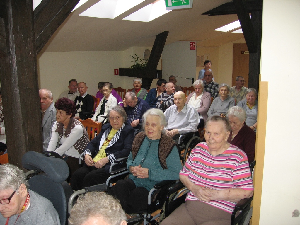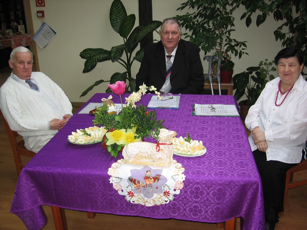 O świąteczną atmosferę i podniosły nastrój spotkania zadbała Pani Irena Madera, przygotowując wespół z mieszkańcami Domu, Panią Marysią Haitner, Panami Marianem Kojderem i Kaziem Lisowskim, wprawiającą nas w wielkanocną aureolę inscenizację drogi krzyżowej.