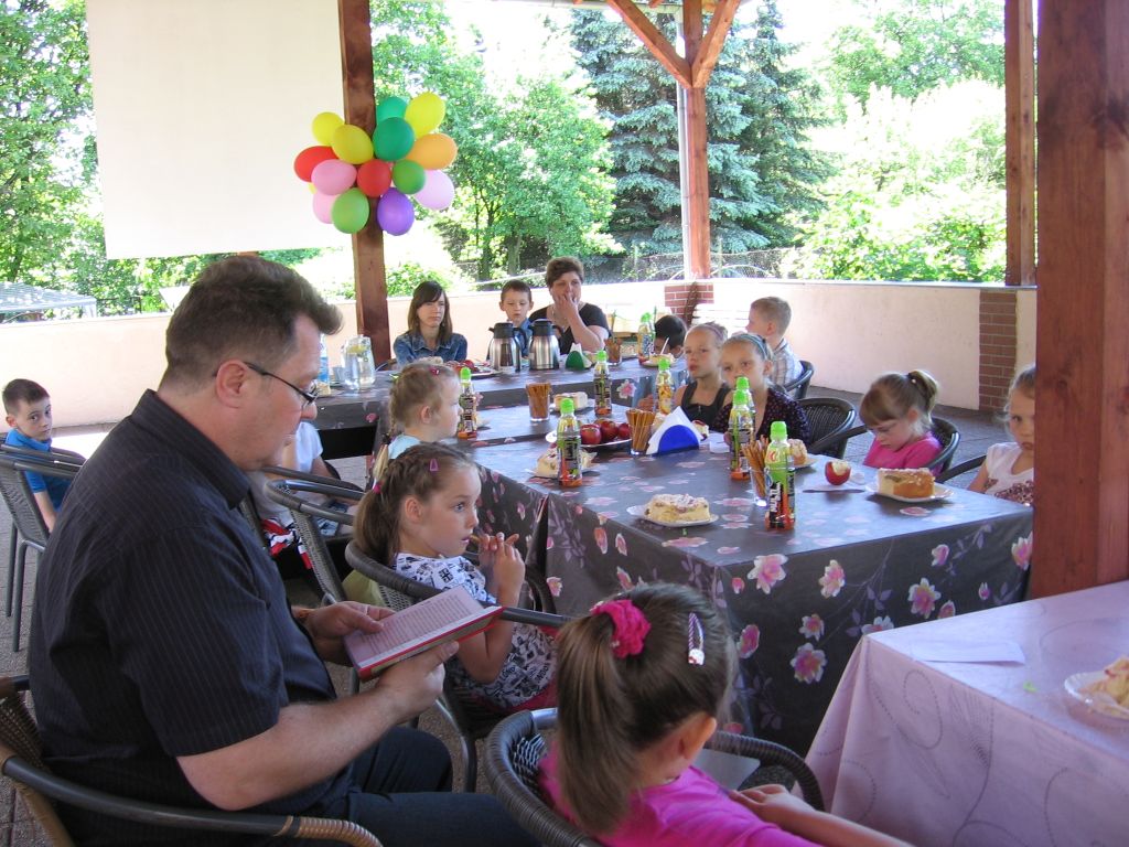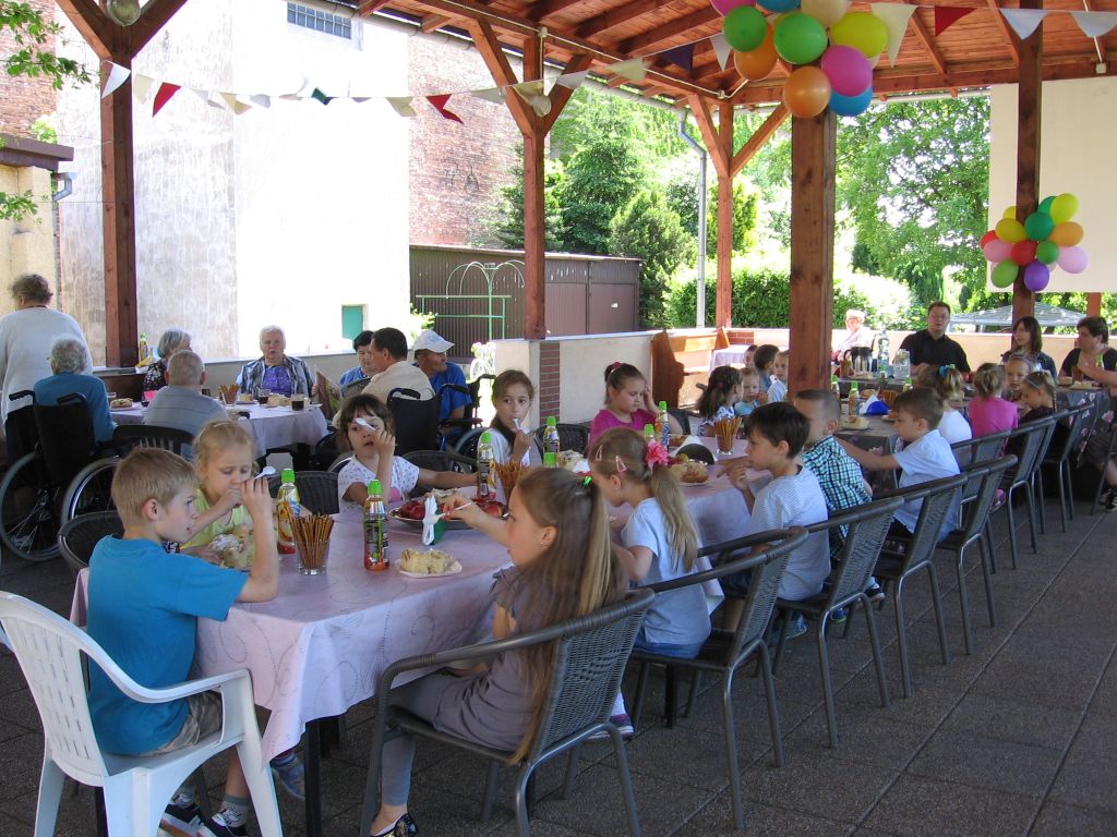 Do akcji „Cała Polska Czyta Dzieciom” włączyli się też seniorzy naszego domu. Dzieci z tej szkoły są częstymi gośćmi w naszej placówce, występując podczas różnorodnych imprez i uroczystości. Spotkanie odbyło się pod wiatą, uroczyście udekorowaną przez naszych mieszkańców . Wszystkich zgromadzonych, a szczególnie dzieci powitał dyrektor Mariusz Półchłopek życząc pierwszoklasistom wszystkiego najlepszego z okazji ich święta a licznie zebrani mieszkańcy zaśpiewali sto lat. Po poczęstunku w postaci smacznego ciasta, lodów i soku dyrektor przeczytał dzieciom opowiadanie Ivony Brezinowej „Cukierek dla dziadka Tadka”, o trudnym temacie jakim jest choroba Alzheimera. Następnie zostało dokładnie omówione. Spotkanie z dziećmi zaprzyjaźnionej z nami podstawówki przebiegło jak zwykle w miłej i życzliwej atmosferze.