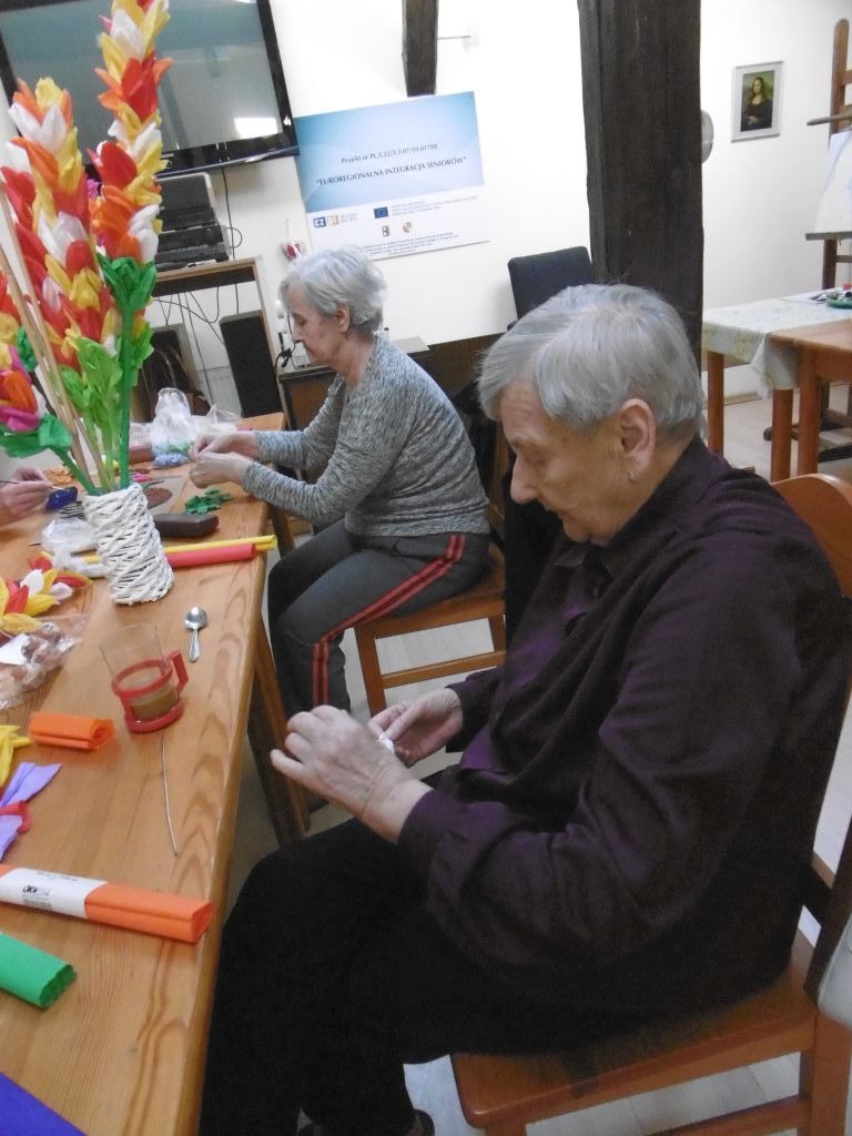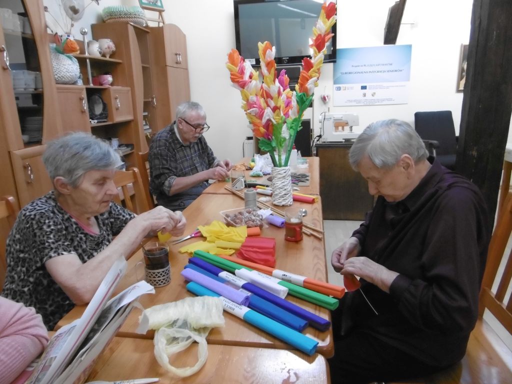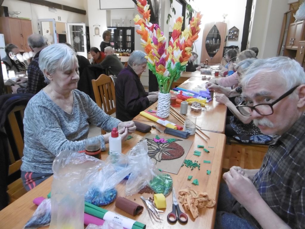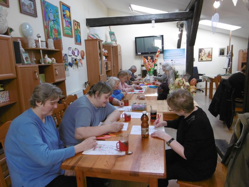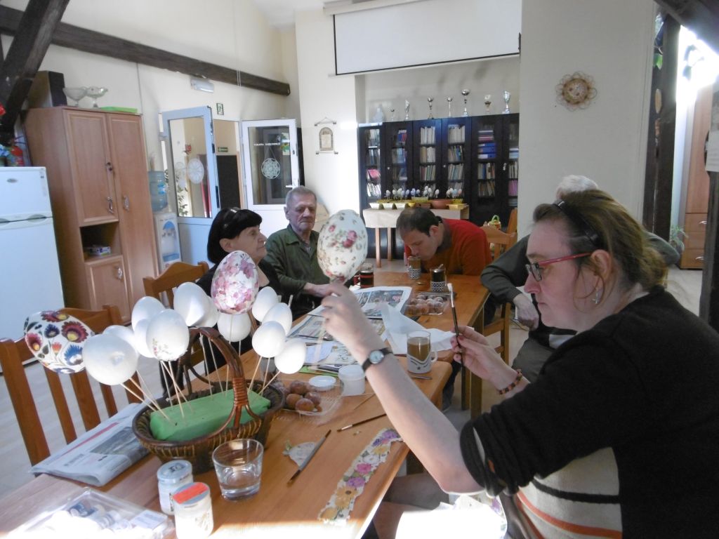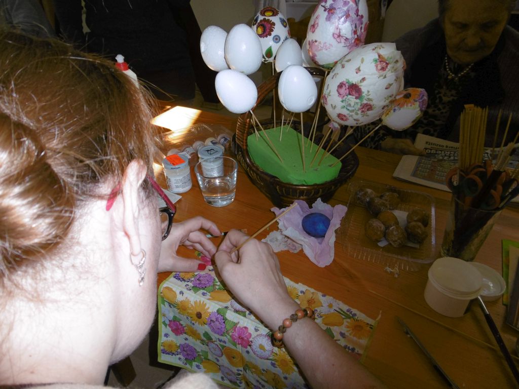 Wspólnie w ramach zajęć arteterapii powstały przepiękne pisanki, zdobione metodą decoupage, kroszonki i palmy wielkanocne. Podczas zajęć rozgorzała też dyskusja na temat: Co było pierwsze jajko czy kura? Po burzliwych konwersacjach i tak nie znaleźliśmy rozwiązania na to pytanie, ale śmiechu było co niemiara.