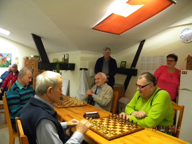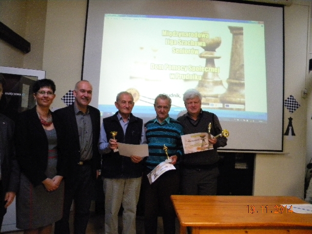 Przypomnijmy, że ligę honorowym patronatem objęli Starosta Prudnicki Radosław Roszkowski oraz Prezydent Kędzierzyna - Koźla Tomasz Wantuła po stronie polskiej, natomiast po stronie czeskiej Starostka Jesenika Maria Fomiczewova. Patronat medialny sprawował Tygodnik Prudnicki. Podczas otwarcia dyrektor prudnickiego DPS-u ponownie podkreślił rolę seniorów w tworzeniu więzi pomiędzy społecznościami polsko-czeskiego pogranicza. Wzmacnianiu tych więzi mają służyć wspólne projekty socjalne, takie jak transgraniczna liga szachowa. Prudnickie zawody i zarazem całą ligę wygrała drużyna seniorów z Głuchołaz przed Czeską Wsią i Kędzierzynem-Koźlem. Czwarte miejsce przypadło Jesenikowi, a gospodarze z Prudnika uplasowali się na 5 miejscu przed czeskimi Skoroszycami. Indywidualnie ligę wygrał Gandziarowski Jan z Głuchołaz, 2 miejsce zajął Chmielarz Ryszard również z Głuchołaz, na zaszczytnym 3 miejscu uplasował się przedstawiciel gospodarzy Mieczysław Kokoszka. Pan Mieczysław otrzymał specjalnie ufundowany dla niego prezent, za dotychczasowe zasługi w krzewieniu sportu pogranicza polsko-czeskiego i za osiągnięcia kapitana drużyny szachowej prudnickiego DPS-u. Drużyny i zawodnicy otrzymali okazałe puchary stosownie do zajętych miejsc. Ponadto każdy z zawodników został uhonorowany za udział okolicznościową statuetką i dyplomem. Puchary i statuetki wręczał obecny na imprezie Starosta Prudnicki Radosław Roszkowski. Starosta podczas uroczystego zamknięcia pogratulował samego pomysłu i organizacji ligi oraz obiecał swoje wsparcie merytoryczne i finansowe, w przypadku kontynuacji projektu w przyszłym roku. Warto nadmienić, że pomysłodawcami tego transgranicznego Projektu byli: dyrektor DPS w Prudniku Mariusz Półchłopek i dyrektor DPD z Jesenika Jan Rotter. Pierwszy turniej odbył się w Jeseniku. Kolejne w Czeskiej Wsi, Kędzierzynie- Koźlu i w Prudniku. Na koniec składamy serdeczne podziękowania dla dyrektora prudnickiego Muzeum doktora Wojciecha Dominiaka, za udostępnienie przedstawicielom i opiekunom przyjezdnych drużyn szachowych, niezwykle interesującej i wzbogacającej o wiedzę historyczną miasta Prudnika ekspozycji w Centrum Tradycji Tkackich. Po zwiedzeniu wystawy przewodnik Marcin Husak zabrał nas na prudnicki rynek, gdzie w bardzo ciekawy sposób zapoznał wszystkich z bogatą historią prudnickiego rynku, uzupełniając swój przekaz wieloma nieznanymi nam dotąd wiadomościami z kart historii Prudnika. Sędzią głównym zawodów w Prudniku był Jan Siekaniec, któremu również dziękujemy za profesjonalną obsługę turnieju.Dodano: Poniedziałek, 24 Listopad 2014r. godz.:17:36.