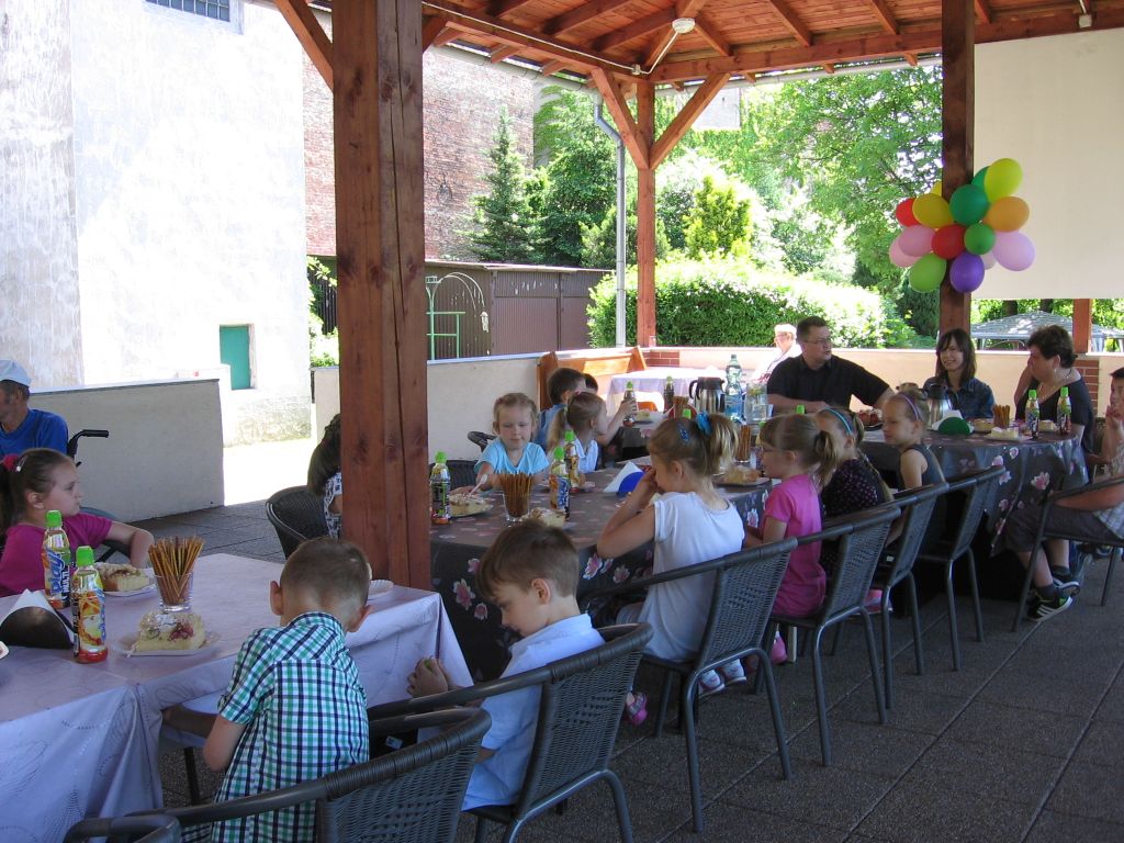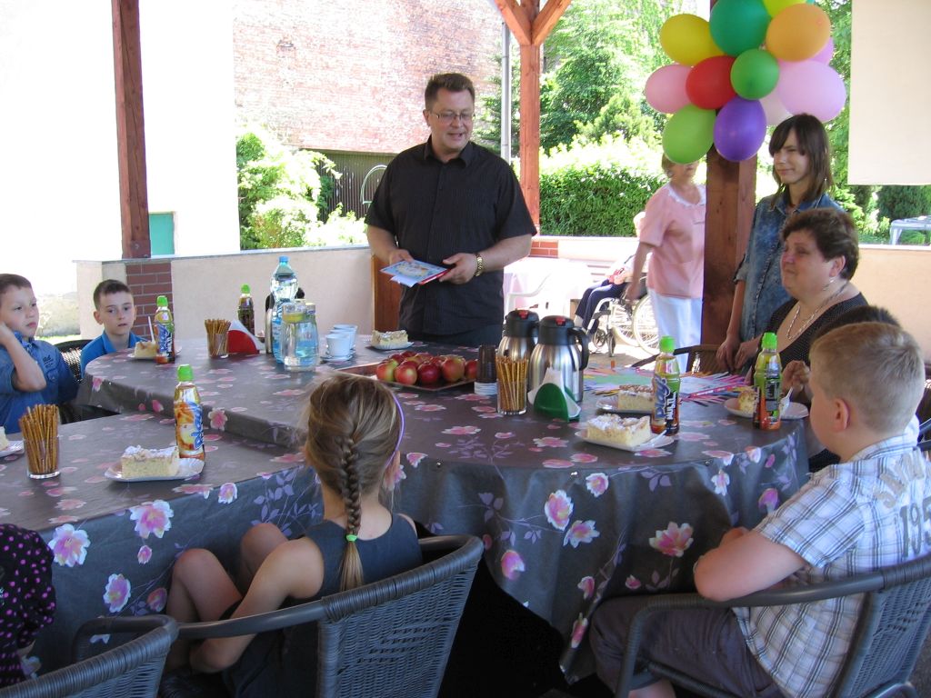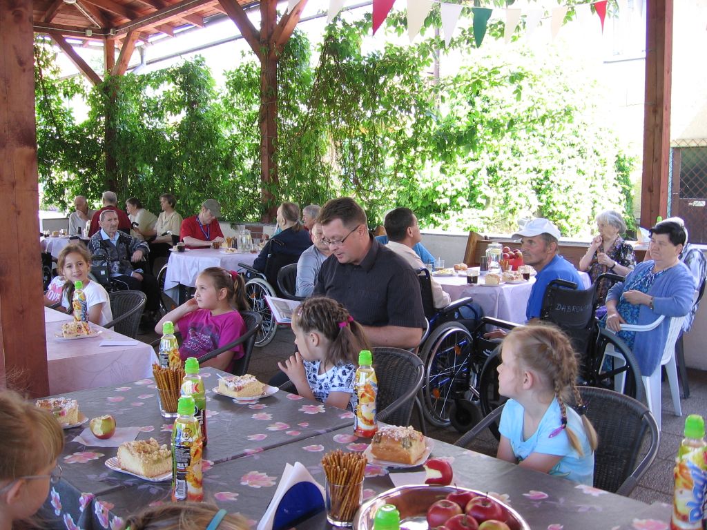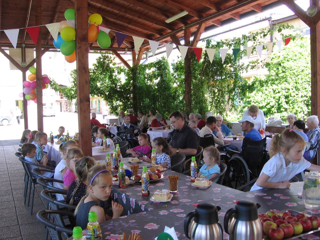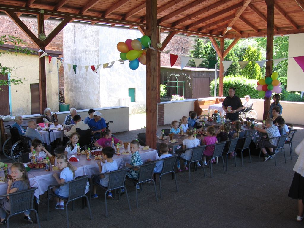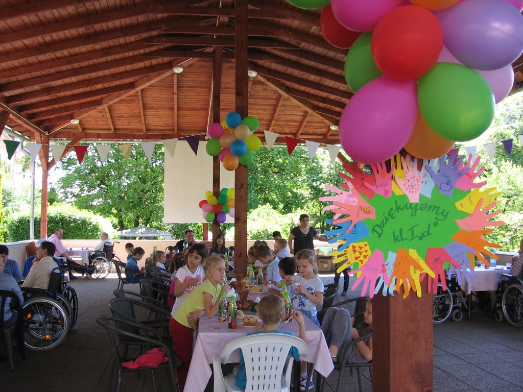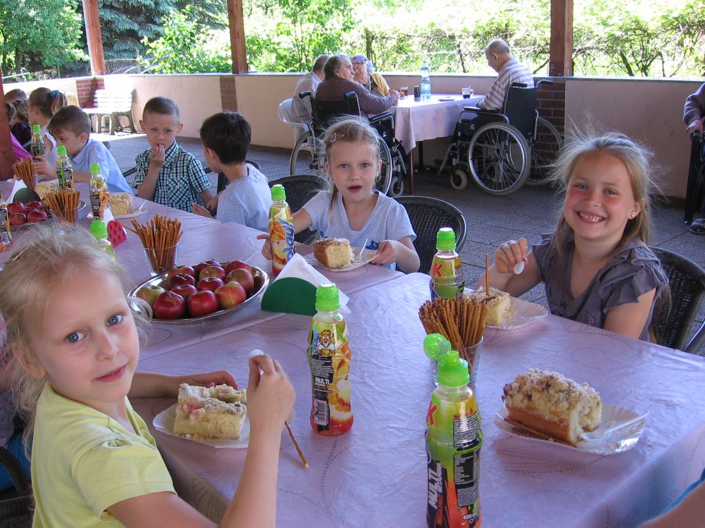 Do akcji „Cała Polska Czyta Dzieciom” włączyli się też seniorzy naszego domu. Dzieci z tej szkoły są częstymi gośćmi w naszej placówce, występując podczas różnorodnych imprez i uroczystości. Spotkanie odbyło się pod wiatą, uroczyście udekorowaną przez naszych mieszkańców . Wszystkich zgromadzonych, a szczególnie dzieci powitał dyrektor Mariusz Półchłopek życząc pierwszoklasistom wszystkiego najlepszego z okazji ich święta a licznie zebrani mieszkańcy zaśpiewali sto lat. Po poczęstunku w postaci smacznego ciasta, lodów i soku dyrektor przeczytał dzieciom opowiadanie Ivony Brezinowej „Cukierek dla dziadka Tadka”, o trudnym temacie jakim jest choroba Alzheimera. Następnie zostało dokładnie omówione. Spotkanie z dziećmi zaprzyjaźnionej z nami podstawówki przebiegło jak zwykle w miłej i życzliwej atmosferze.